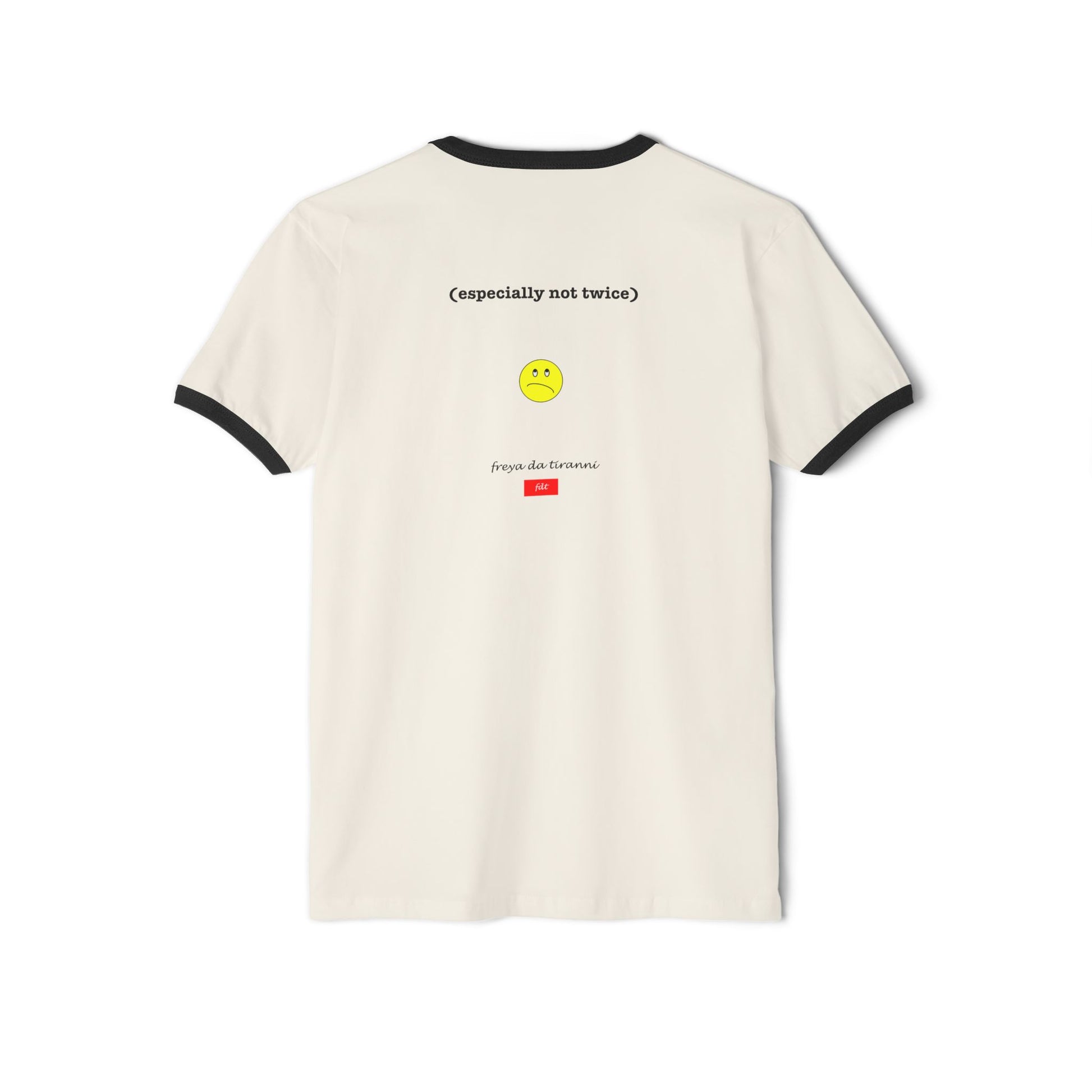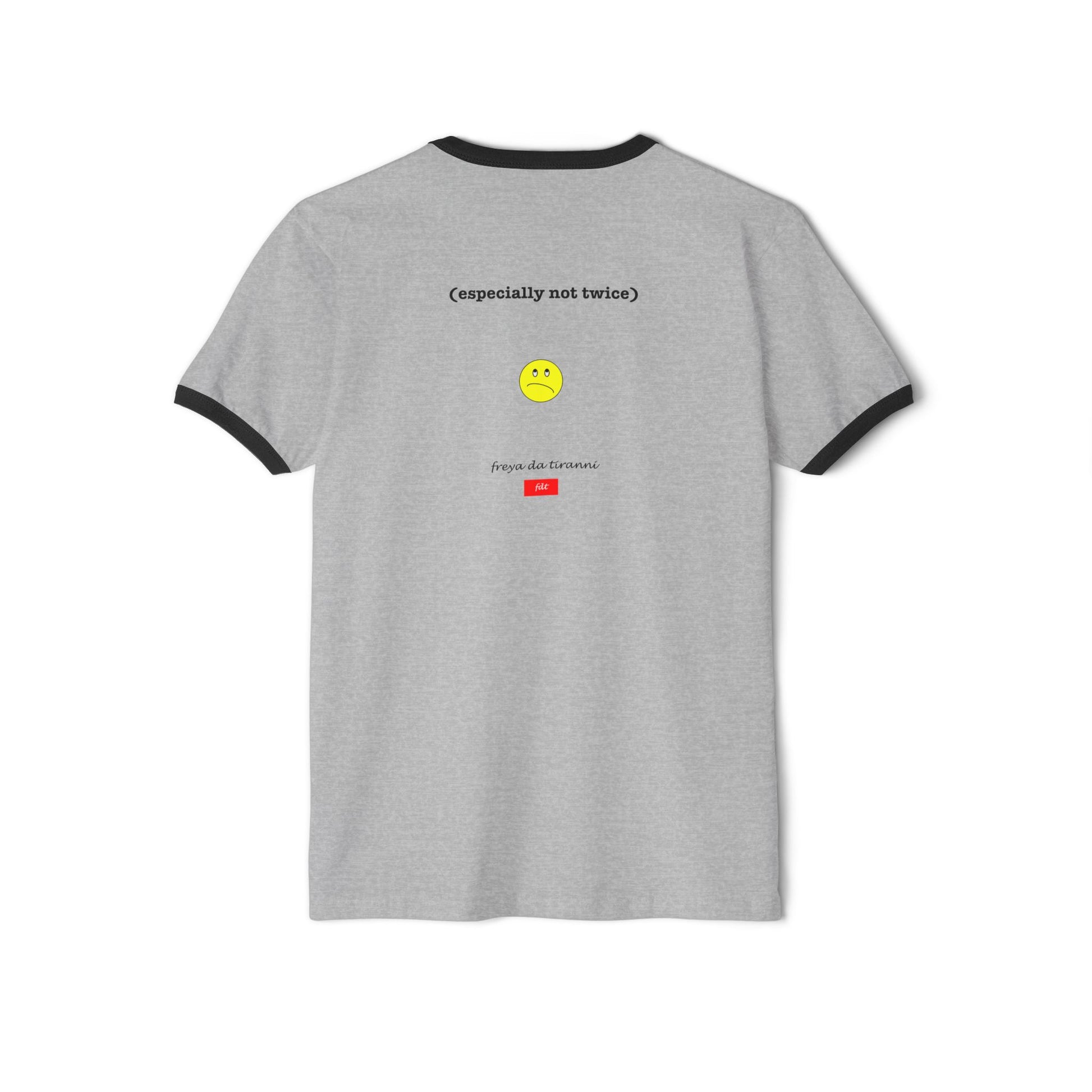 Part of the Freya Da Tiranni (FDT) Defining Styles Collection, this short-sleeve Ringer T-shirt cautions people that dementia is not a laughing matter - and something you should never elect to make fun of (especially not twice).